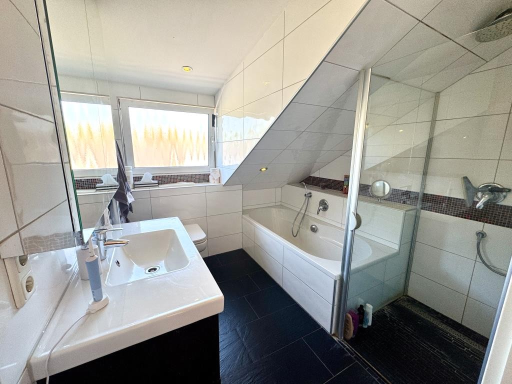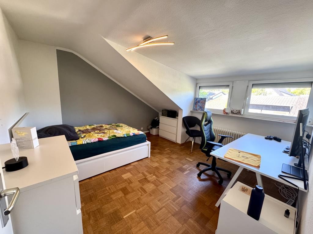 Im Obergeschoss befinden sich ein großes Schlafzimmer mit eigenem Balkon, zwei gut geschnittene Kinderzimmer sowie ein modernes Tageslichtbad mit Badewanne und separater Dusche.