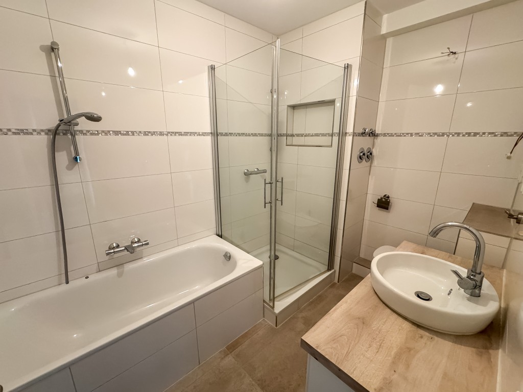 Das hell geflieste Badezimmer ist mit einer Badewanne und einer separaten Dusche ausgestattet.