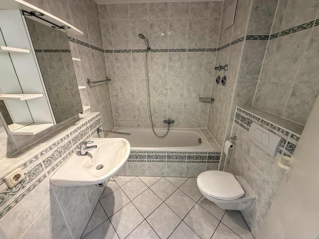 Das hell gefließte Bad ist mit einer Badewanne ausgestattet.